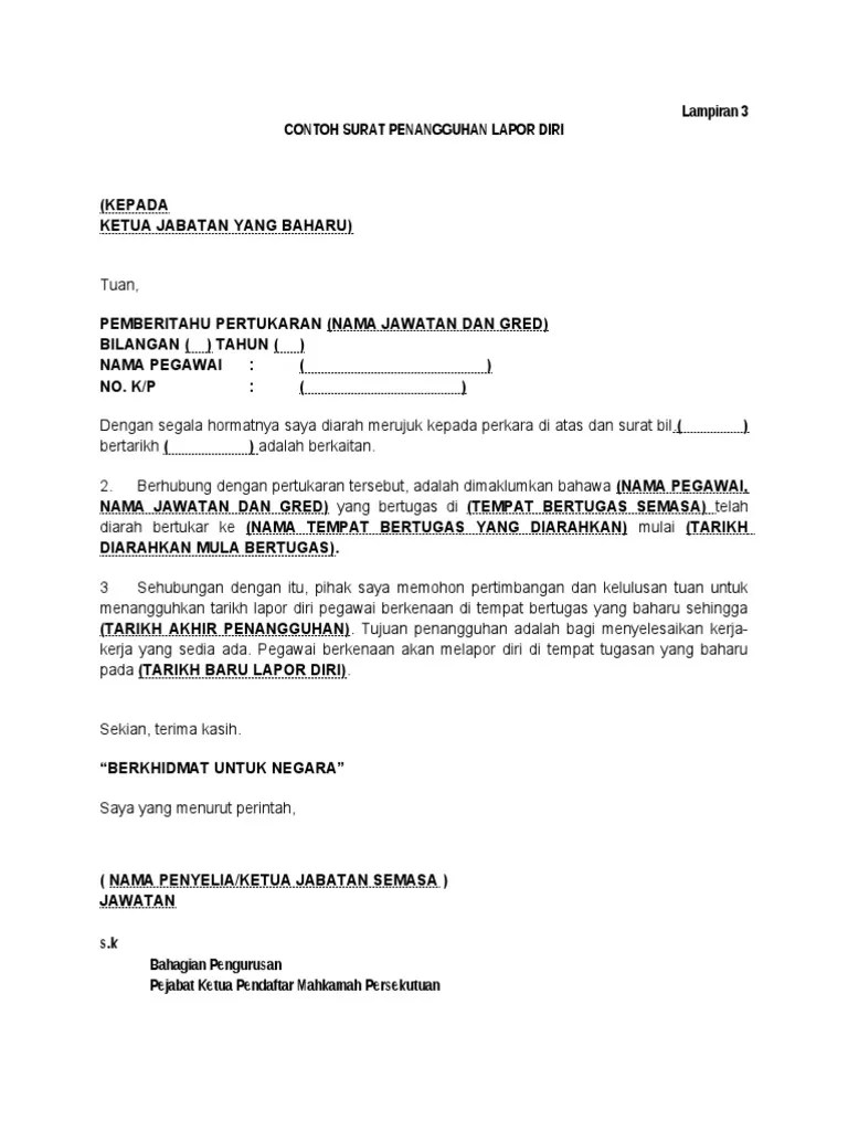 Savesave contoh surat penangguhan lapor diri for later. Berikut adalah contoh surat permohonan penangguhan lapor diri / bertugas yang boleh dijadikan contoh : Contoh surat pengunduran diri dari guru. Berikut beberapa contoh surat pengunduran diri atau surat resign dengan penulisan yang benar dan sopan, dilengkapi dengan trik dan tips pembuatannya. Mau buat surat, buka dulu contohsuratindonesia.com