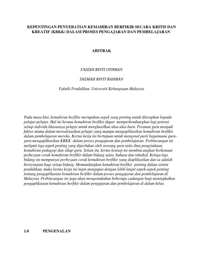 @inproceedings{mahat2006pengaplikasiankb, title={pengaplikasian kemahiran berfikir secara kreatif dan kritis (kbkk) dalam menyelesaikan masalah reka cipta}, author={mahyon mahat and adnan ahmad}, year={2006} }. Kecekapan dan keupayaan menggunakan minda untuk menilai kemunasabahan atau kewajaran sesuatu idea, meneliti kebernasan, kebaikan dan kelemahan sesuatu hujah, dan membuat pertimbangan yang wajar dengan menggunakan alasan dan. Kepintaran akal atau ' intelligent' tidak bererti mempunyai kemahiran berfikir kema kemahi hiran ran berfik berfikir ir secara secara kritis kritis merupa merupaka kan n kece kecekap kapan an dan keupaya keupayaan an. Ainon dengan bermain permainan digital implimantasi kemahiran berfikir kritis pelajar bagi. Darjah (abu bakar nordin, 2013;